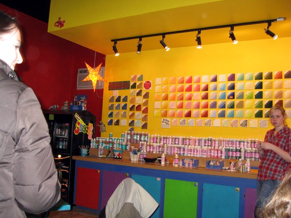 Clay Café – это изумительная коллективная творческая мастерская. Главное пространство – огромный зал, вдоль стен - деревянные полки, заполненные разнообразнейшими керамическими (вернее, еще глиняными) изделиями. Тарелки, чайники, чашки, супницы, скульптуры, игрушки, рамки для фото, вазы, плитки, стаканы, Санта-Клаусы… И т. д. и т. п. Всё – белое. Всё – полуфабрикат. Превратить полуфабрикат в яркое, уникальное произведение искусства – твоя задача. Кисти на столах, краски – на отдельном стеллаже, альбомы с трафаретами в помощь новичкам тоже имеются. В общем, все условия для творчества. Аня разрисовывает плиточку