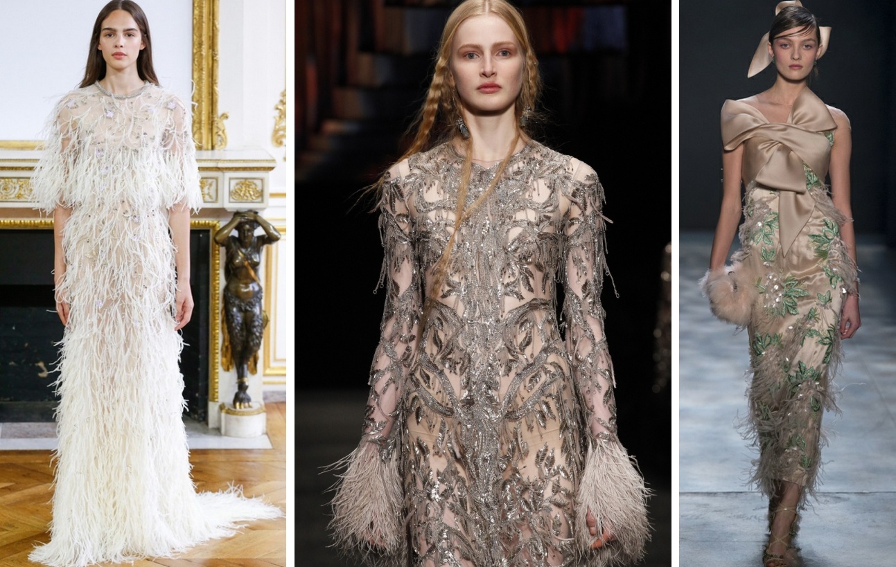 Тренды: растительный принт, украшение-ошейник, срезанные плечи, колготки с блестками, банты, золото.