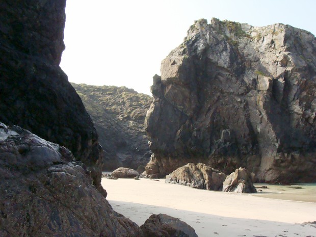 Спустившись на небольшой пляж, мы провели там ещё около часа, прогуливаясь среди скал причудливых форм. Было ощущение нереальности происходящего. Казалось, что мы снимаемся в фильме, а вокруг – декорации. Народу внизу, на пляже, было мало. В основном, все посетители Kynance Cove остались в кафе - наслаждаться видом с чашечкой кофе и маффинами (маффины - это маленькие порционные кексы). Ещё дальше, в пещеры, рискнули пойти только мы и ещё один мужчина, судя по снаряжению серьёзно занимающийся хайкингом (хайкинг – пешая прогулка в горы).