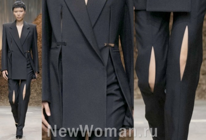 Тренды: деловой женский костюм черного цвета с разрезами и вырезами на жакете и юбке, с асимметричным смещением правой полы пиджака и застежкой на одну боковую пуговицу.
