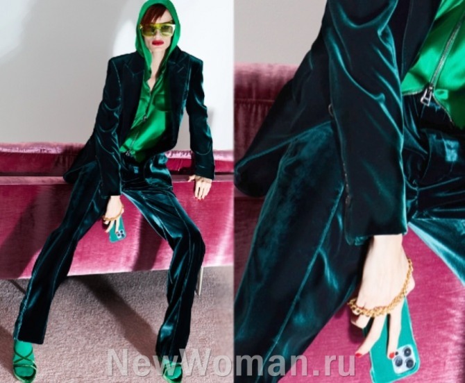 2. Велюр. Тренды: зеленый монохром в стиле тотал-лук, классический брючный женский костюм из велюра изумрудного цвета - в комплекте с тканевой ветровкой с капюшоном и колготами ядовито-зеленого цвета.