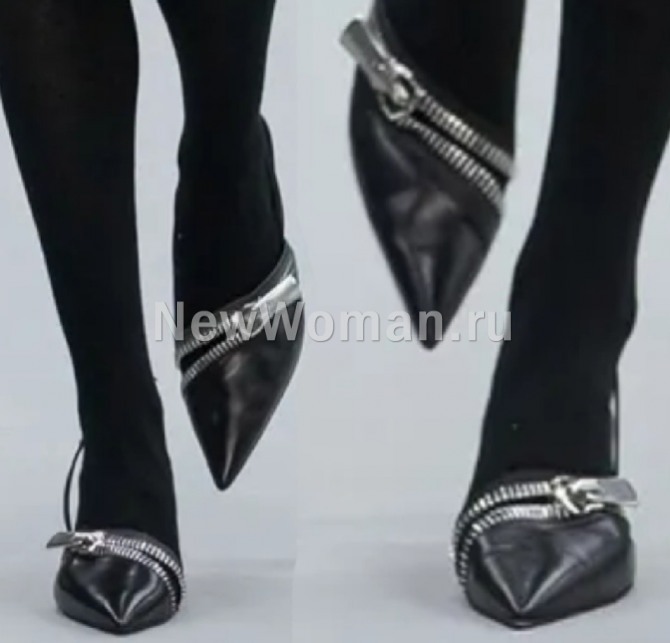 12. Диагональные молнии. Черные туфли-лодочки из кожи с косыми срезами на подъеме стопы и диагонально расположенными на нем молниями в качестве декора.