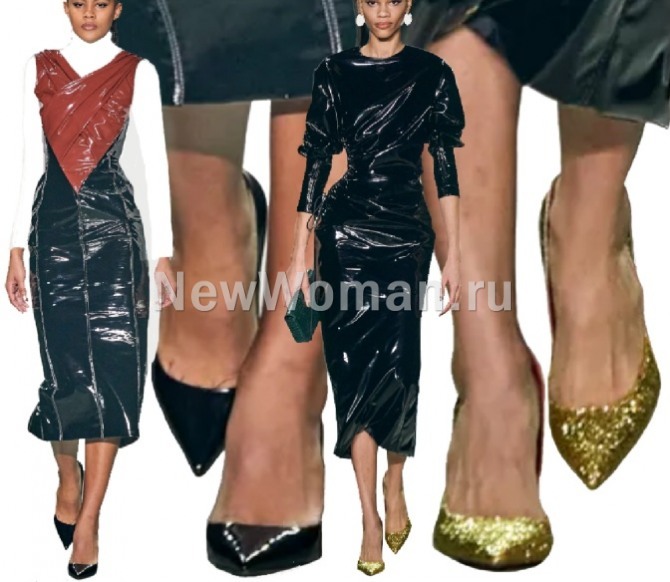 2. Bibhu Mohapatra Тренды: нарядные стильные вечерние образы с платьями из лаковой кожи и туфлями-лодочками из черного лака, а также с лодочками с глиттером из металлизированного материала цвета золота.