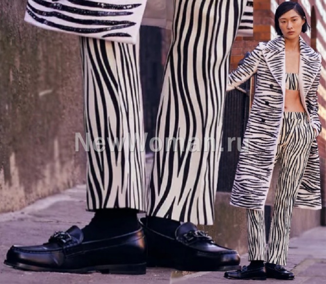 10. Черные кожаные лоферы. Тренды: стильный весенний лук в черно-белой цветовой гамме: черные кожаные туфли-лоферы в комплекте с черными носками и костюмом (пальто, брюки, топ) с принтом "зебра".