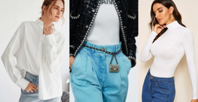 1. Классические джинсы с высокой посадкой плюс нарядный или освежающий лицо верх (жакет, блузка, джемпер, водолазка):