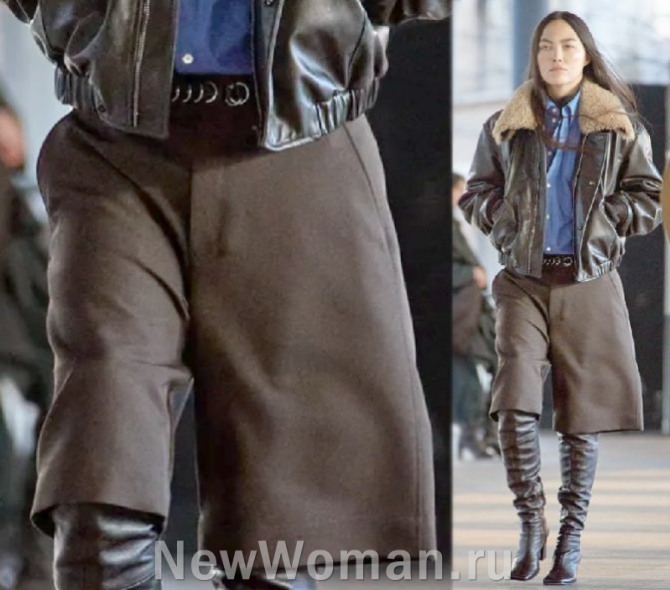 6. Женская кожаная куртка-пилот + шорты-бермуды. Зимний уличный образ 2024 года в коричневой цветовой гамме из Парижа - кожаная куртка-пилот с бежевым меховым воротником, сапогами-чулками и с шортами-бермудами длиною до колен.