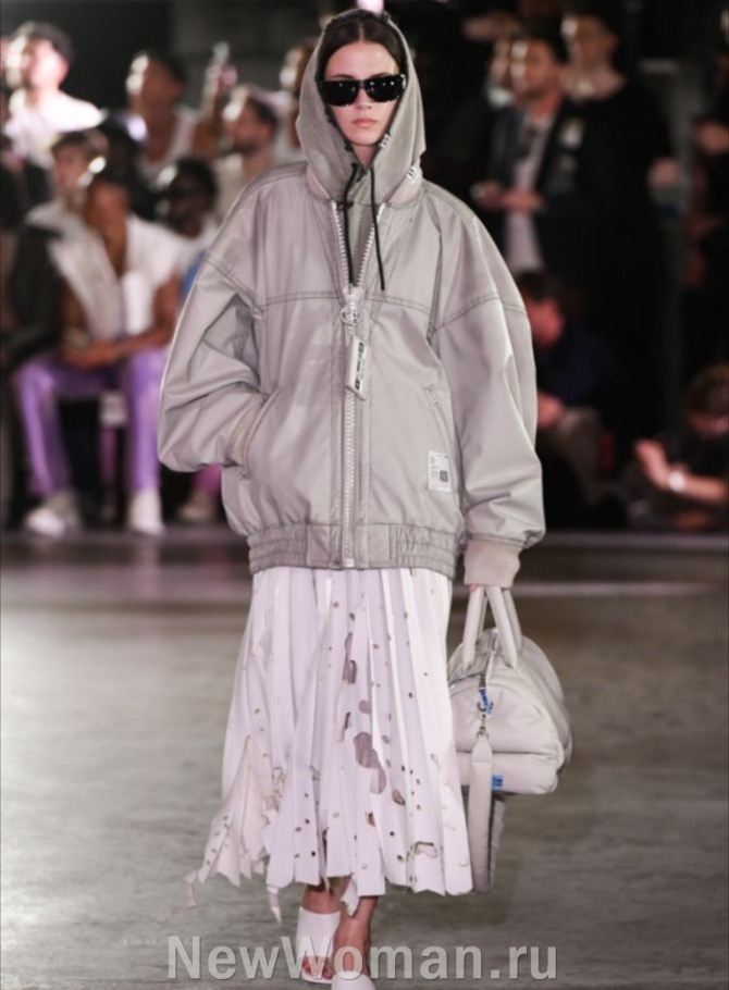 2. Maison Mihara (Париж) Men’s Spring 2024 Светло-бежевый весенний лук. Куртка, худи с капюшоном и сумка - выполнены в холодных светло-бежевых тонах, а юбка и обувь - в теплых светло-бежевых оттенках.