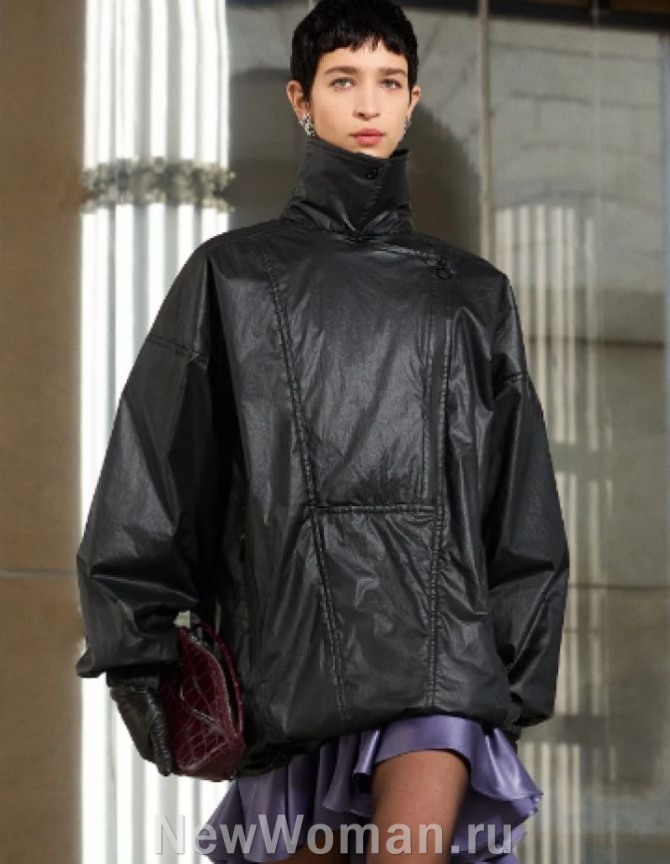 5. Ребристый нейлон. Материал нейлон в рубчик выбран не случайно, а для создания арочной формы силуэта куртки оверсайз с покатыми плечами и широкими рукавами.